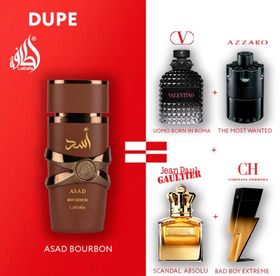 El perfume Asad Bourbon de Lattafa Eau de Parfum es una fragancia masculina intensa, misteriosa y absolutamente envolvente. Inspirada en la fuerza, la confianza y el magnetismo natural del hombre moderno, esta versión de la icónica línea Asad de Lattafa fusiona lo mejor de la perfumería árabe con un toque occidental sofisticado: el irresistible aroma del bourbon, una nota cálida, dulce y embriagadora que convierte esta fragancia en una experiencia sensorial única. Reconocido por su similitud con perfumes reconocidos como Valentino Uomo Born in Roma, Azzaro The Most Wanted, JPG Scandal Absolu y Carolina Herrera Bad Boy Extreme.