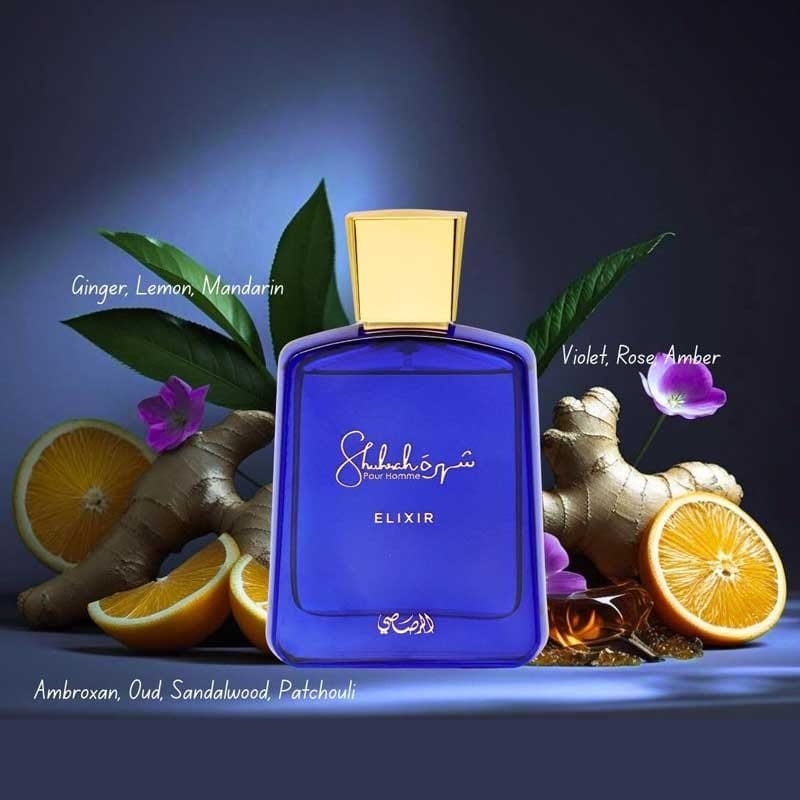 - La fragancia Rasasi Shuhrah Elixir hombre abre con una combinación impactante y moderna de bergamota fresca y manzana jugosa, que aportan un contraste entre dulzura y frescura, despertando los sentidos desde el primer instante. Esta salida vibrante prepara el camino para un corazón complejo y distintivo.